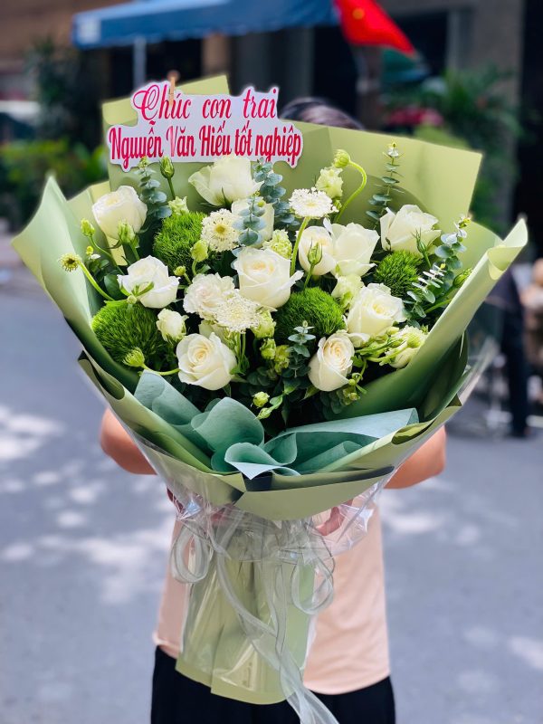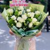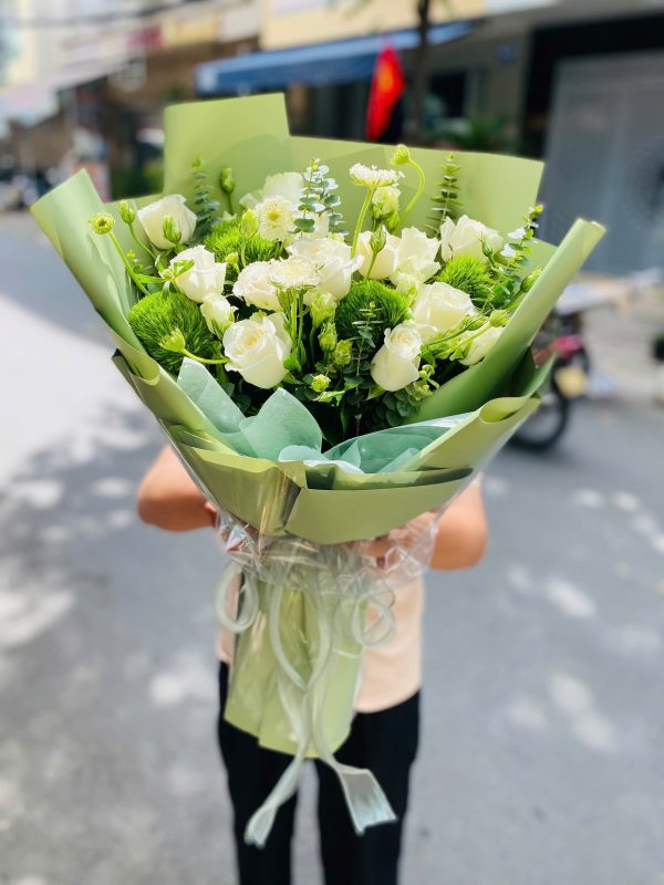 Bó hoa Crystal Dew được kết hợp tinh tế từ hoa hồng trắng, hoa lá phụ điểm xuyến, tổng thể bó hoa tựa như những giọt sương trong trẻo buổi sớm mai. Gam màu trắng – xanh thanh khiết mang đến cảm giác nhẹ nhàng, sang trọng và vô cùng tinh tế.
