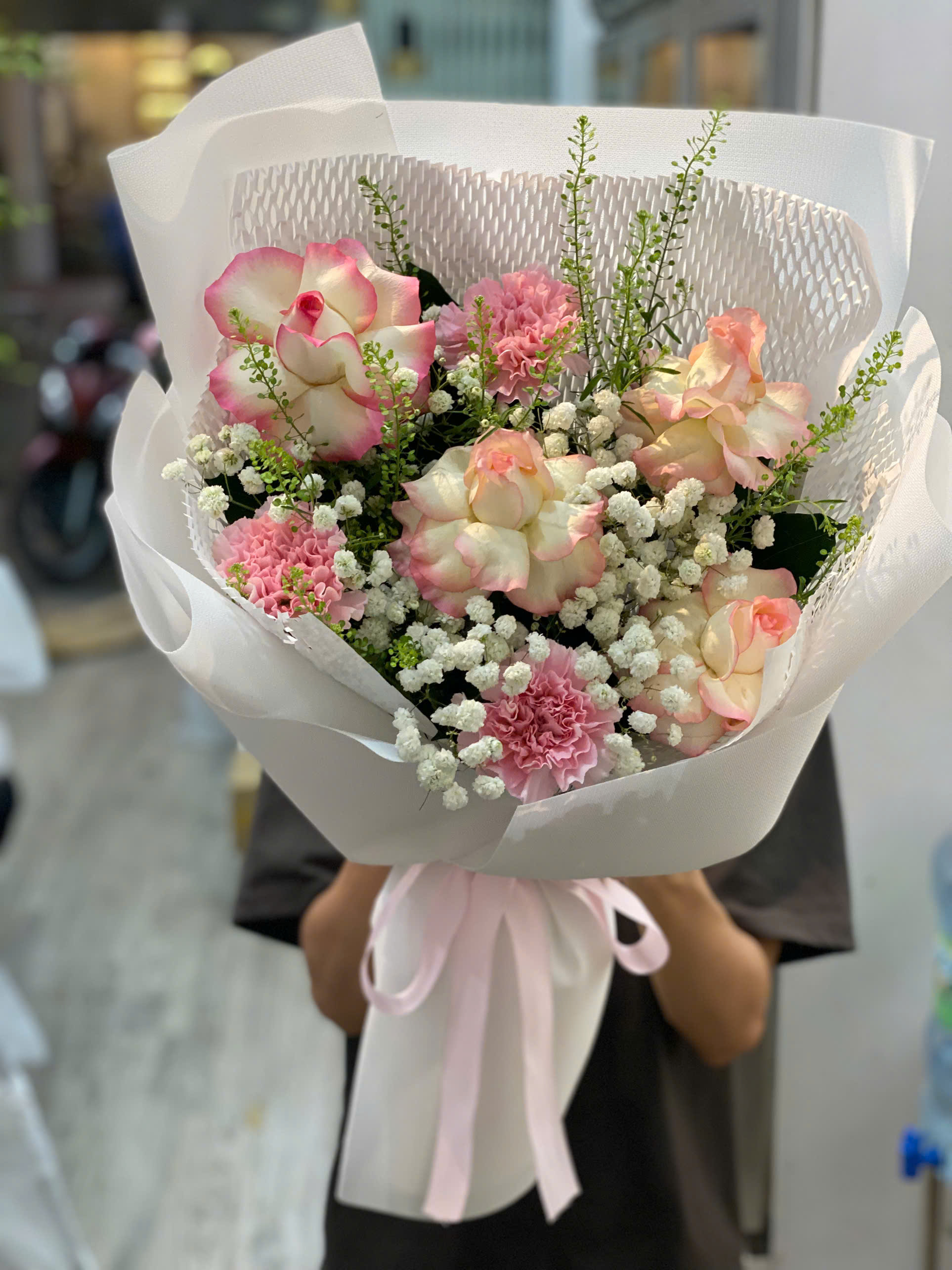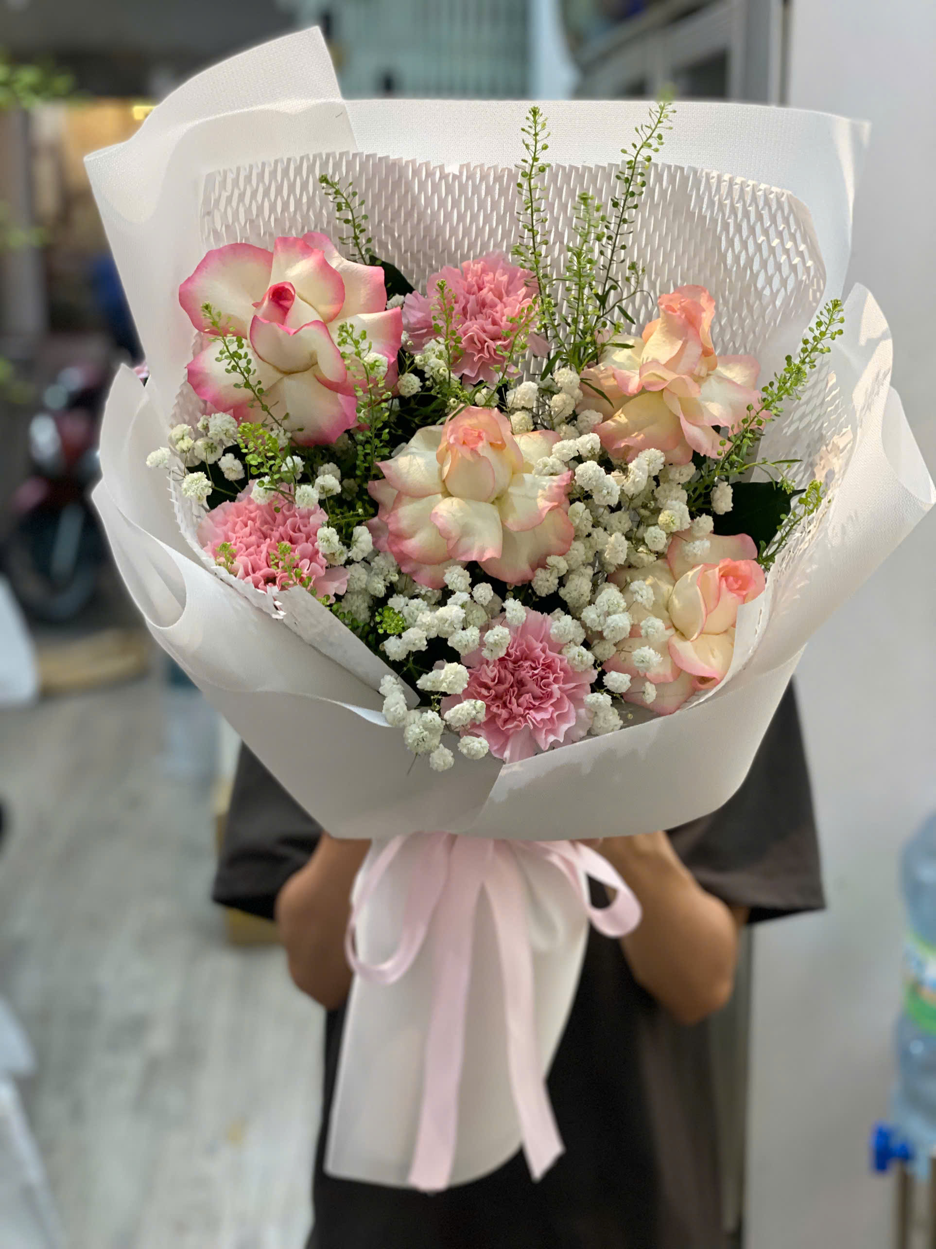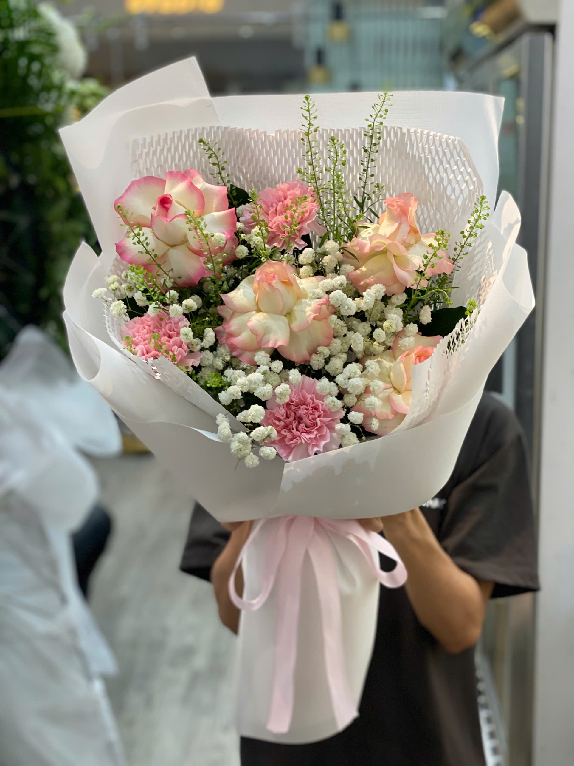 ** Vì các loại hoa lá phụ sẽ có tùy vào thời điểm trong năm, Hoatuoituongnguyen đảm bảo các loại hoa chính, các loại hoa lá phụ sẽ thay đổi phù hợp giá cả và thiết kế sản phẩm.